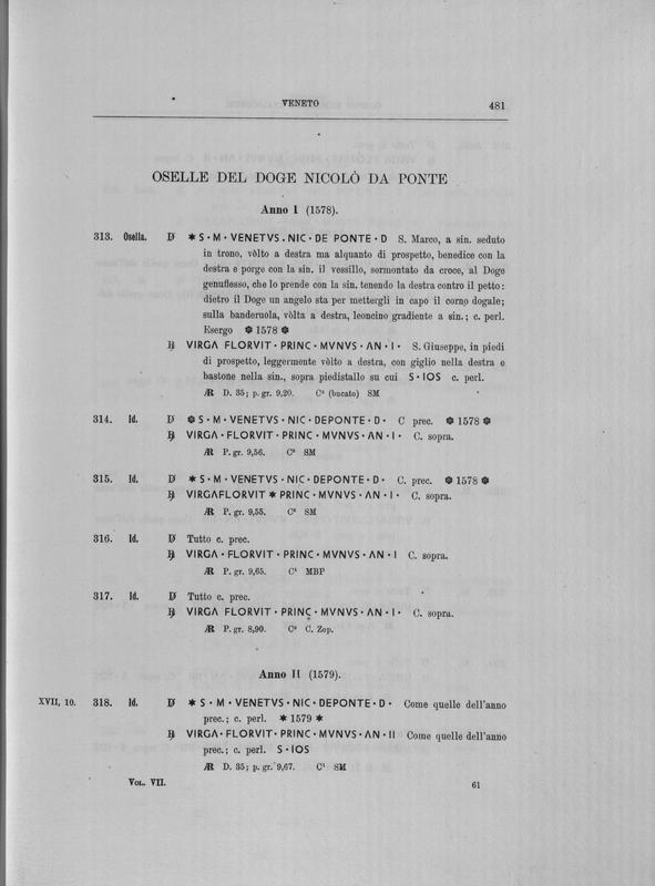 Corpus nummorum italicorum : primo tentativo di un catalogo generale delle monete medievali e moderne coniate in Italia o da italiani in altri paesi , 7: Veneto : Venezia. 1, Dalle origini a Marino Grimani