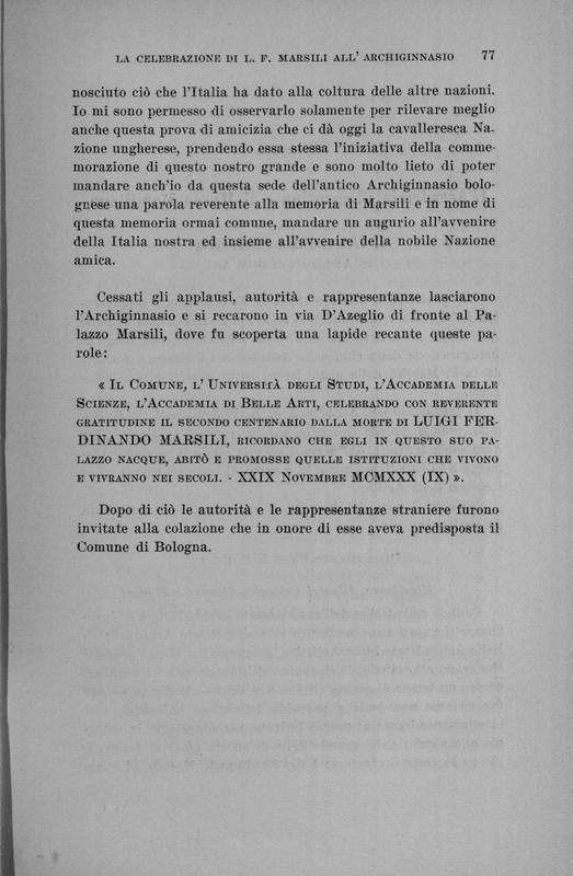 Celebrazione di Luigi Ferdinando Marsili nel secondo centenario dalla morte, 29-30 novembre 1930 : relazione delle cerimonie e discorsi a cura del Comitato ordinatore (R. Accademia delle scienze dell'Istituto di Bologna)